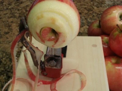 - Slice: Using a peeler, corer, slicer, slice the apples and cut them in half.