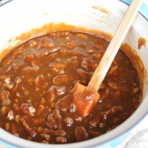 - Once the ingredients are combined and no longer separated, remove from heat and add the pecans.