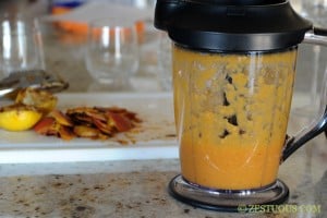 - Remove the skins from the remaining peaches and place in a blender. Squeeze the juice from the lemon into the blender. Make sure you donโt get any lemon seeds in there. Chill in the refrigerator for at least 15 minutes. Add 2 cups ice. Blend until smooth.