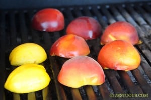 - Heat grill to medium-high. Place peaches and lemon on the grill cut-side down and grill for 3 minutes.