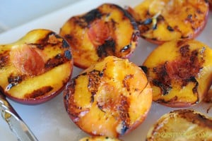 - Remove from grill. Set aside 1 peach half for the garnish.
