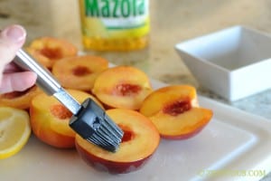 - Slice the peaches in half and remove the pit. Slice the lemon in half. In a small bowl, combine the Mazola Corn Oil and sugar. Brush on the cut side of the peaches and lemon.