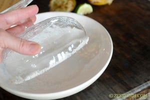 - Place ยผ cup kosher salt on a small dish. Dip the rim of each glass into the salt.