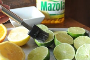 - Cut the citrus in half. Cut one half of a lime into 3 slices. In a small bowl, combine the Mazola Corn Oil, sugar and ยผ teaspoon kosher salt. Brush the mixture on the cut side of the citrus fruit.
