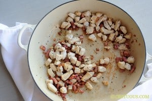 - Heat a large skillet over medium-high heat for 3 minutes. Add the pancetta to the pan. Using a wooden spatula, occasionally stir the pancetta for 5 minutes until it browns. Add the chicken, salt, pepper, sage and optional cayenne pepper to the pan. Continue to stir occasionally for 5 minutes.