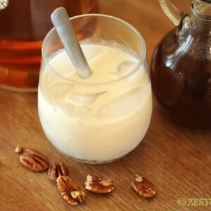 Fill a kid-friendly glass with ice. Fill it one-half full with Sprite or 7-Up. Add an ounce or so of Spiced Pecan Simple Syrup. Top it off with milk or cream. Stir with a straw, chocolate Twizzler or thin carrot stick.